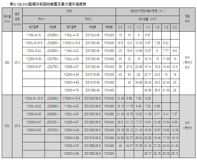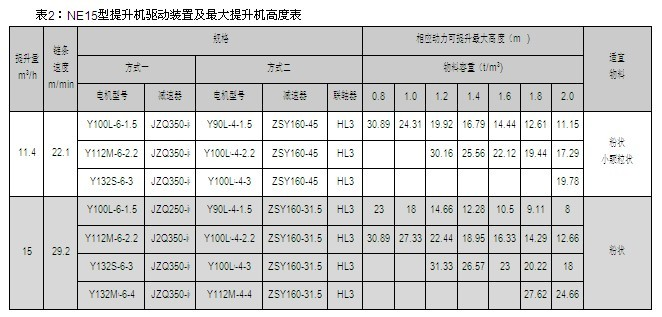 NE15、NE30、NE50、NE100、NE150、NE200、NE300、NE400型提升機的提升量上限、提升高度上限及動力配備表見表2~9,選擇NE500、NE600、NE800型提升機時,請與本公司技術部聯(lián)系。